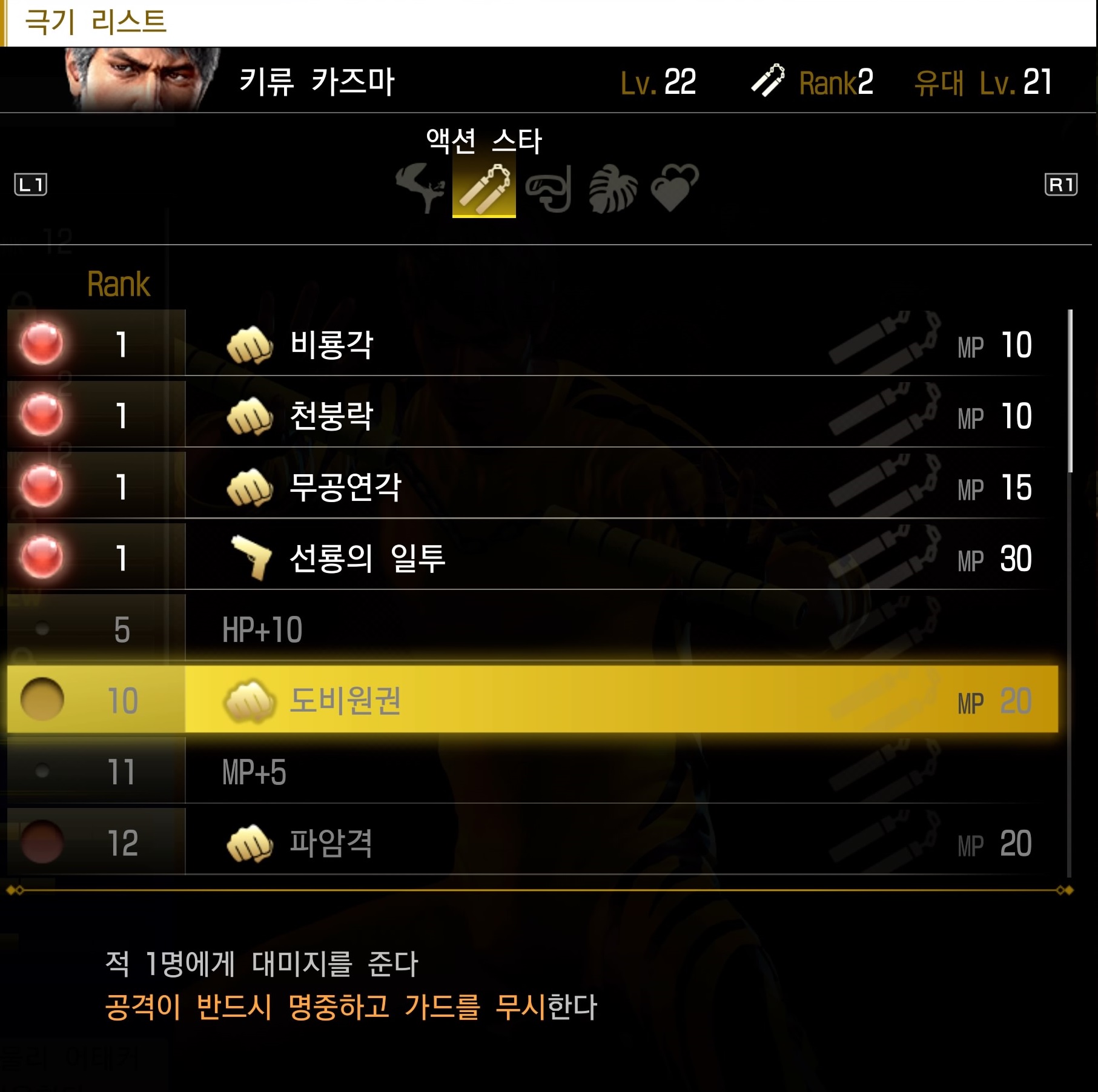 - 물리 극기를 버프해주는 '용신불굴의 춤'까지 챙기고 싶을 경우 18 랭크까지 키우고 도지마의 용으로 재전직