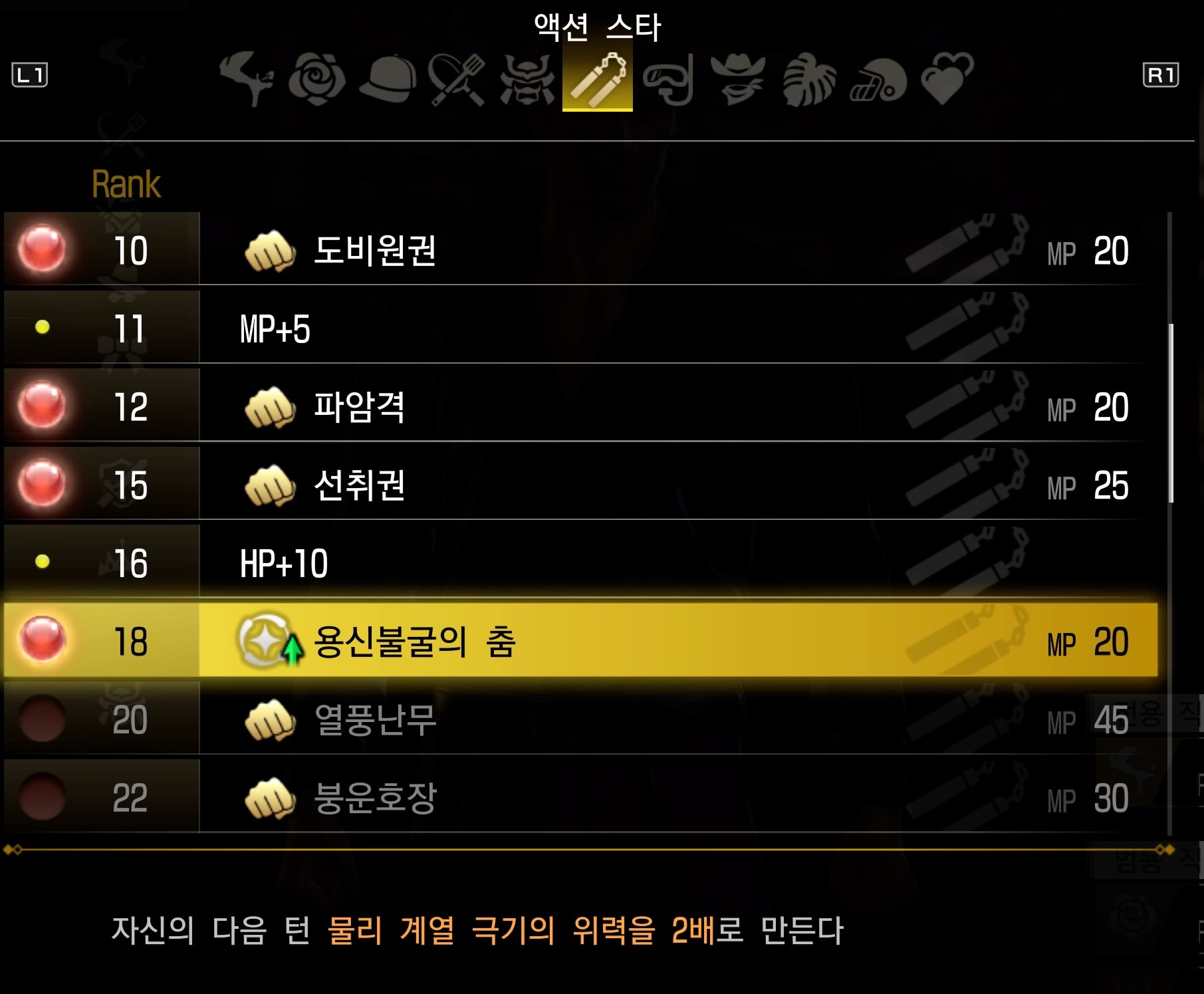 - 물리 극기를 버프해주는 '용신불굴의 춤'까지 챙기고 싶을 경우 18 랭크까지 키우고 도지마의 용으로 재전직