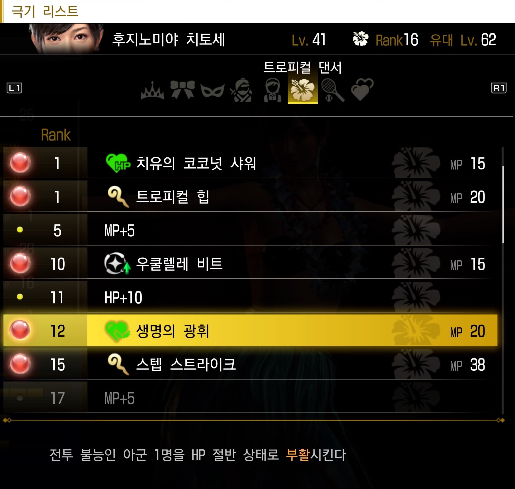 이후 첫 전직으로 트로피컬 댄서를 선택할 수 있는데, 타격기 외에 회복, 부활 스킬들을 두루 갖추고 있다. 파티의 안정성을 높이고 싶다면 '생명의 광휘'까지 얻어서 언제든 계승 기술로 쓸 수 있게 해두자.