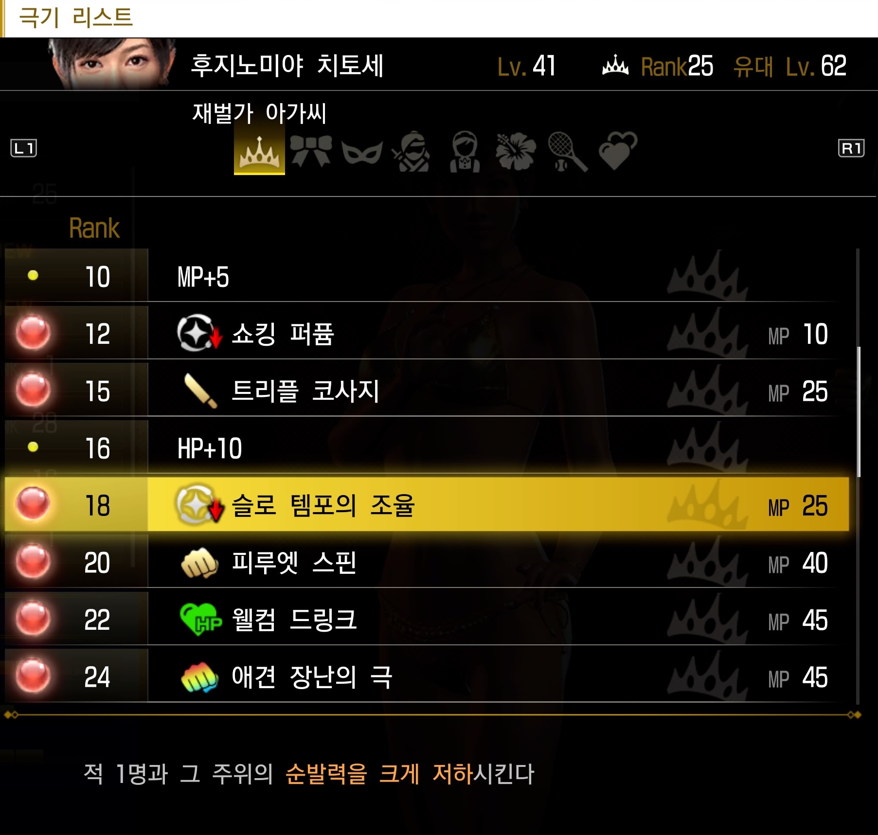 후반에는 재벌가 아가씨로 돌아와 지금까지 습득한 계승 기술들과 디버프 극기 '슬로 템포의 조율'을 활용해 아군의 턴이 더 자주 돌게 만들 수 있다. 한 명에게 거는 것이 아니라 범위로 걸 수 있어 더욱 유용하다.