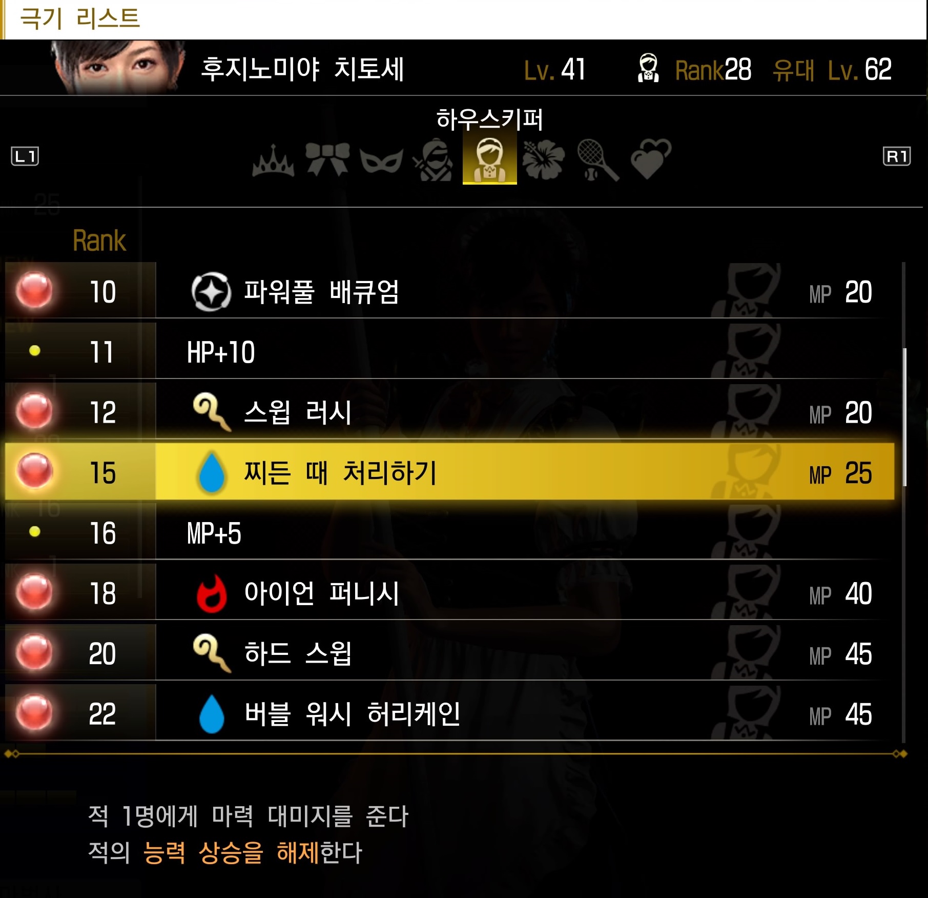 또한 22 랭크에 얻는 회복 극기 '웰컴 드링크'의 성능도 훌륭하다. 넓은 범위의 아군 회복은 물론, 쌓여있는 디버프들까지 한 꺼번에 지워주는 기술. 덕분에 상태 이상을 자주 거는 강적들과의 싸움에서 유용하게 쓸 수 있다.