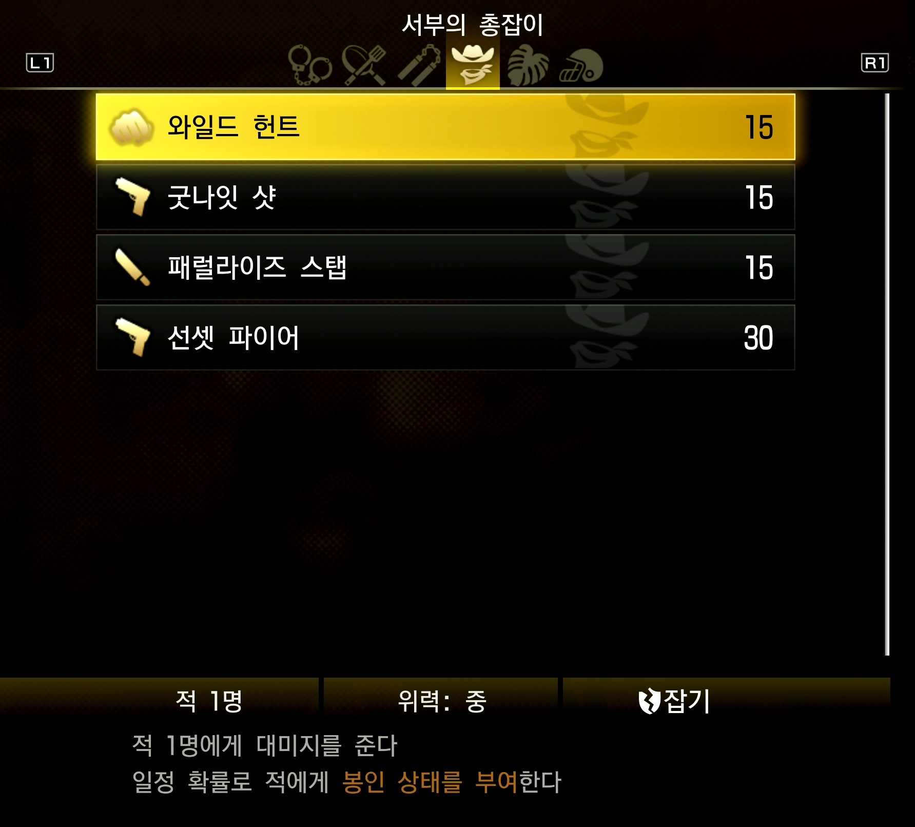 - 그런 상황을 대비해 '잡기'까지 챙기고 싶을 경우 '서부의 총잡이'로 전직, '와일드 헌트'만 계승 기술로 얻고 무사로 재전직하자