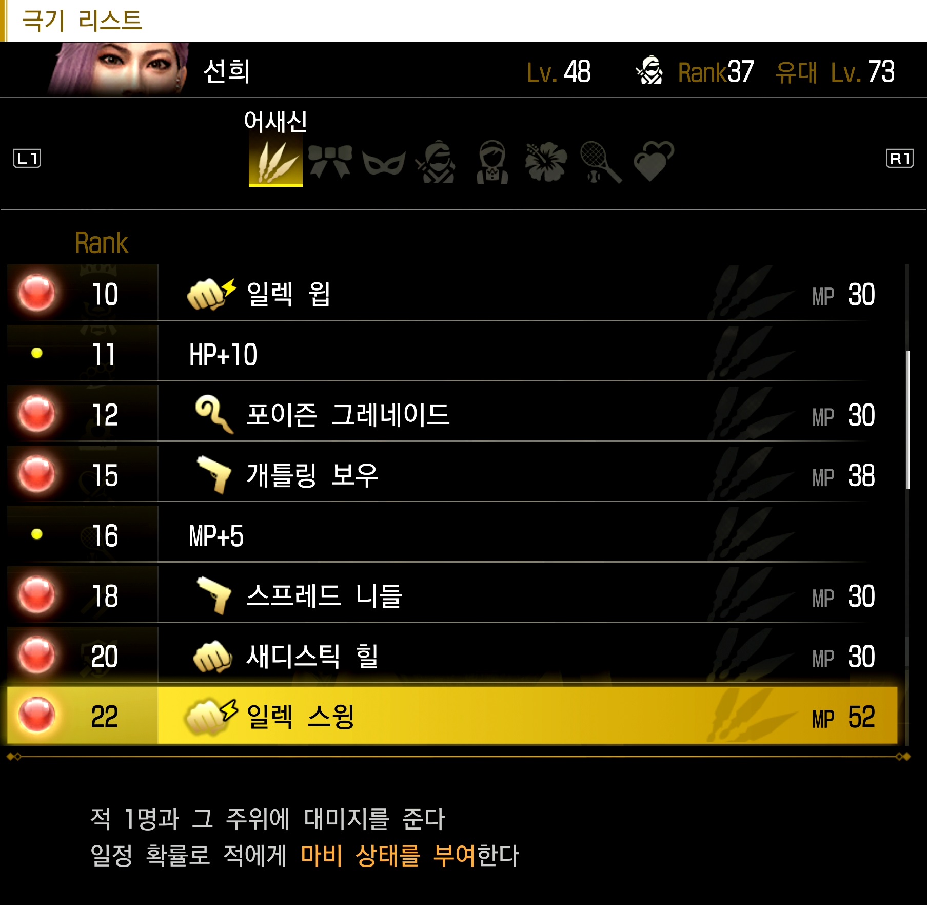 쿠노이치의 가장 큰 특징은 높은 순발력. 비슷한 레벨의 적들과 싸운다면 대부분 선희가 첫 턴을 잡게 된다. 이때 어쌔신에서 계승한 '일렉 스윙'을 다수의 적에게 맞추면 전투를 매우 유리하게 시작할 수 있다.