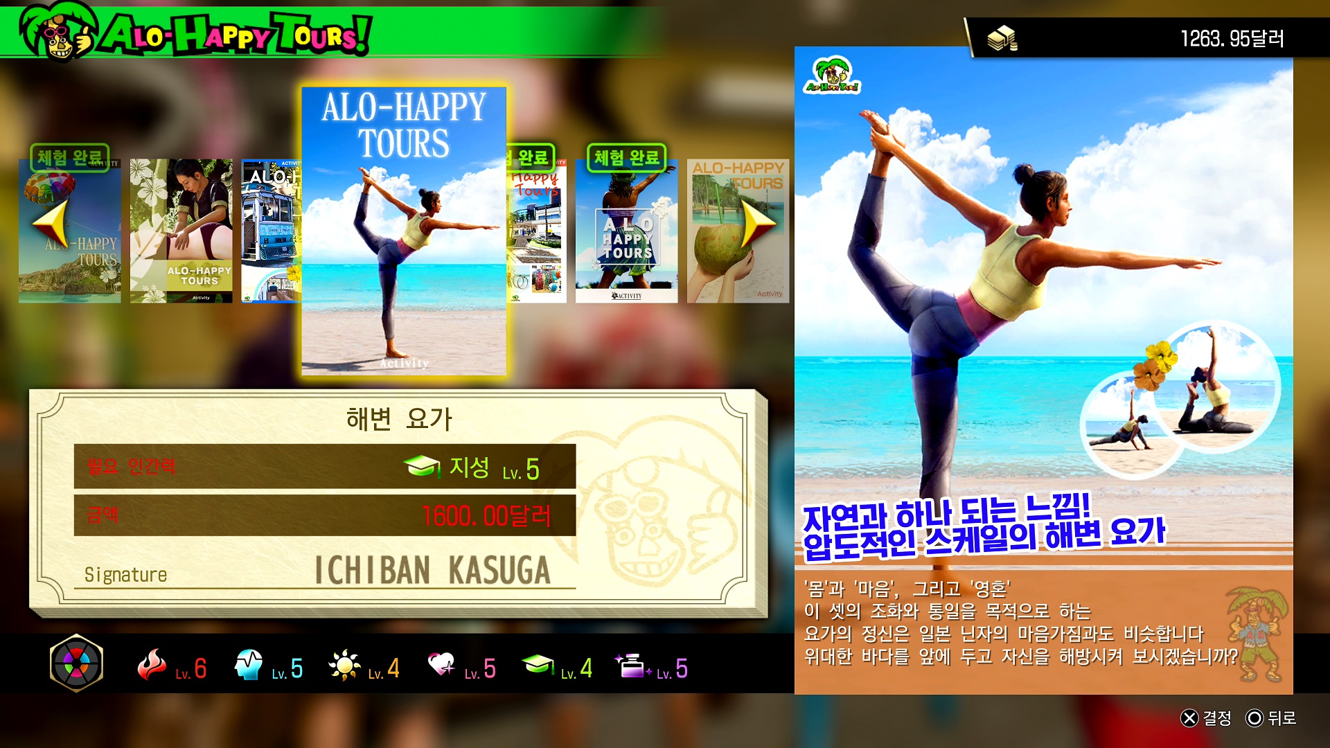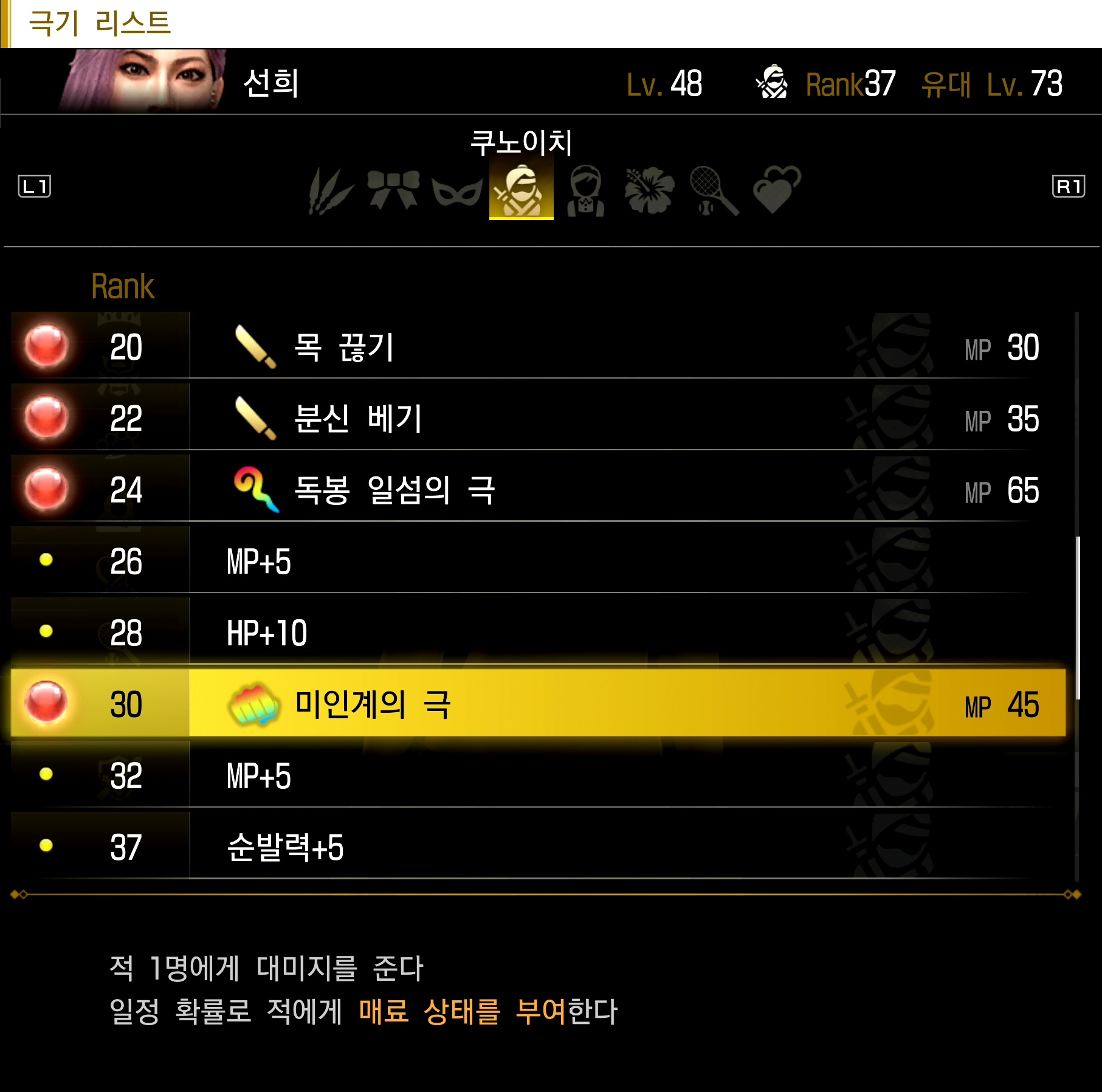 이치반 파트일 때 인간력 '지성 Lv.5 달성', '돈 1600 달러'를 모으면 알로 해피로 가서 바로 '해변 요가'를 선택하자. 그러면 쿠노이치 전직이 가능해지는데, 키류 파트가 되었을 때 선희를 바로 전직시키면 된다.