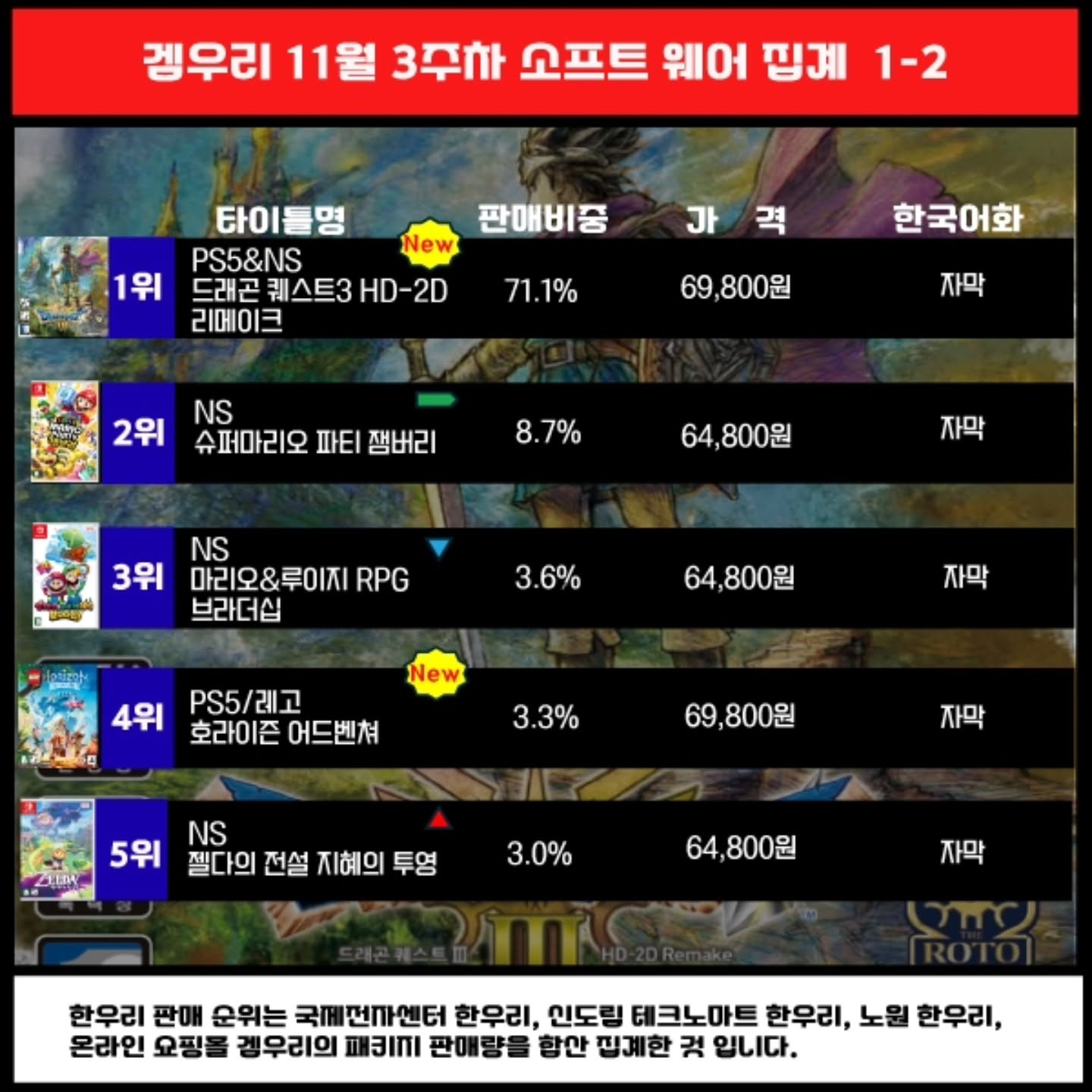 2024년 8월부터 한우리 인스타그램에서 판매 순위를 공개하고 있습니다. 구글 검색으로 KONSOLER 아카이브에 들어오시는 분들이 게임 판매 현황, 인기 순위 등을 파악하실 수 있도록 이미지 형식의 글로 남겨두겠습니다.
