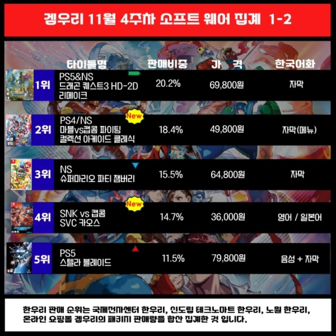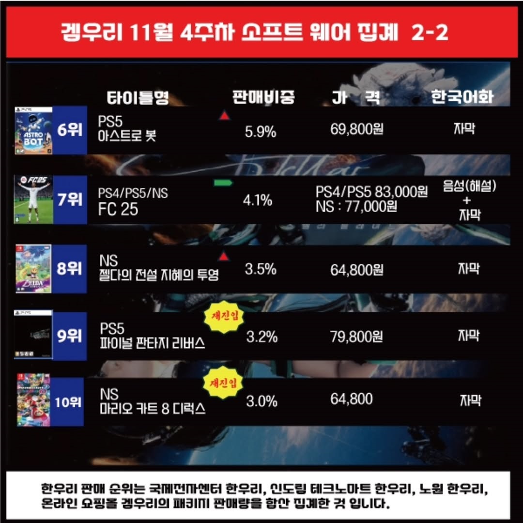 2024년 8월부터 한우리 인스타그램에서 판매 순위를 공개하고 있습니다. 구글 검색으로 KONSOLER 아카이브에 들어오시는 분들이 게임 판매 현황, 인기 순위 등을 파악하실 수 있도록 이미지 형식의 글로 남겨두겠습니다.