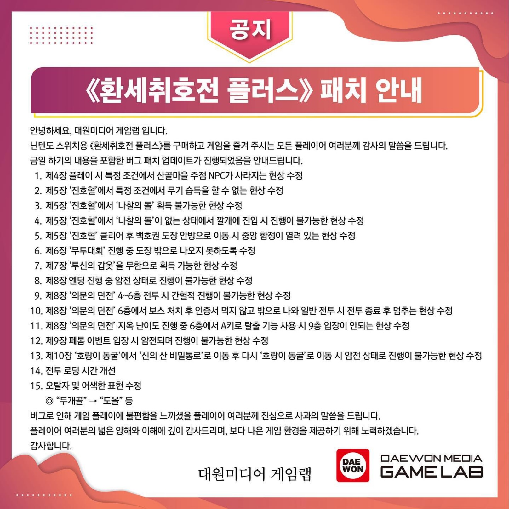[환세취호전+]가 출시 첫 주 1위를 거뒀지만, 상황이 좋지 않다. 여러 타입의 진행 불가 버그들이 나왔고, 아직 정확한 원인이나 회피법이 나오지 않았으며, 버그 발생 후 세이브 데이터를 덮어 썼을 경우 처음부터 다시 하는 방법 밖에 없다. 대원미디어 측에서 사태를 인지하고 패치 예정임을 밝히긴 했지만, 얼마나 빠르게 진행되느냐가 관건일 듯 하다.